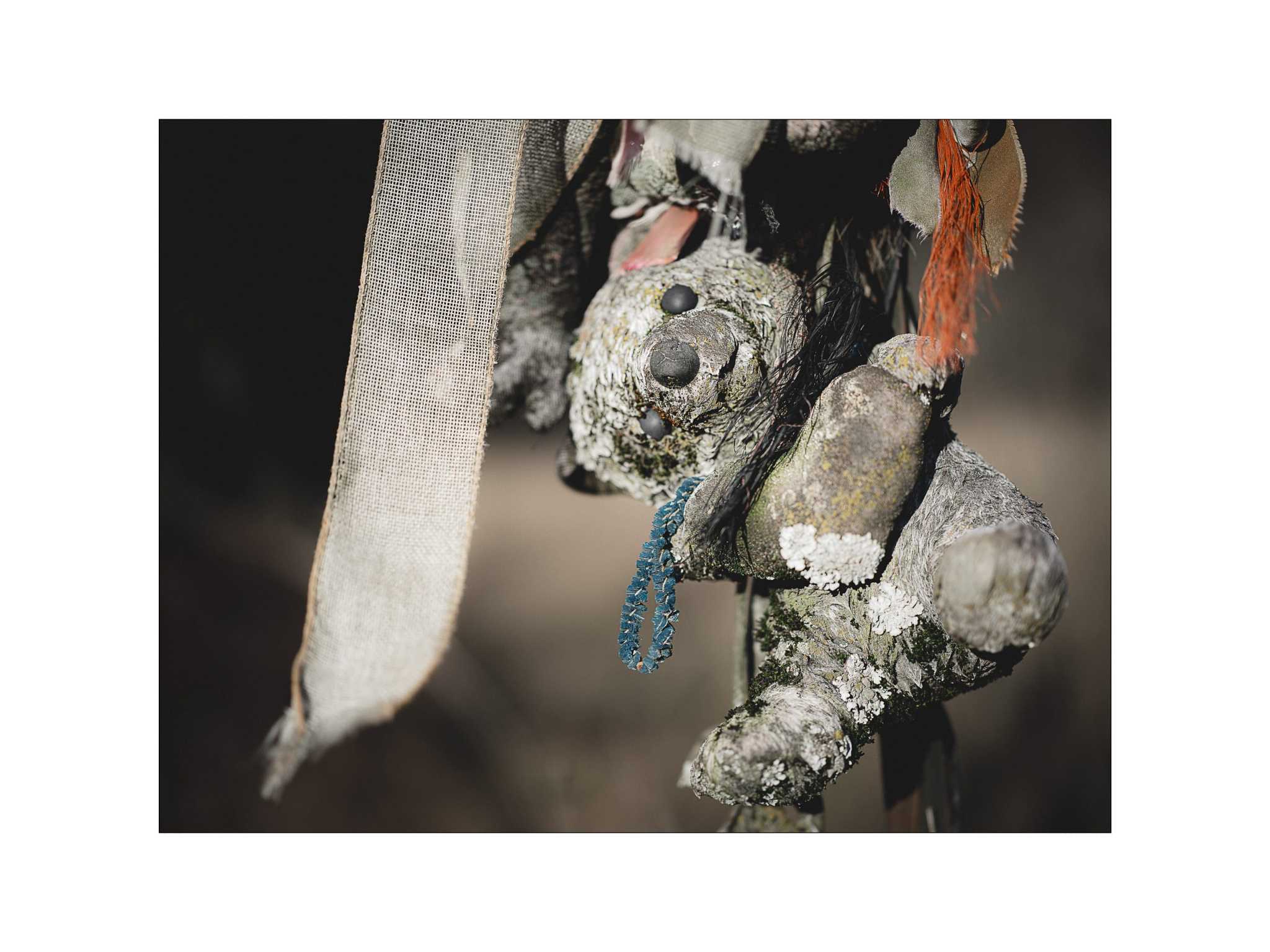 No identifying marks on this one, and perhaps it’s best because damn, this memorial is kinda creepy. Three stuffed animals hang on the two posts, possibly identifying two lost lives. The first post has what I believe to be a sloth …