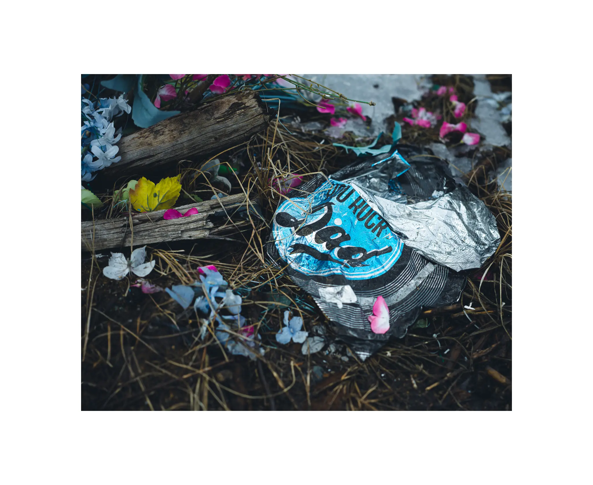 Another faded teddy bear at this site, quite possibly the same bear but in decidedly better shape. It’s painful to me to think about Richard’s young son or daughter leaving their favorite bear on the side of the road so that daddy could be near it.