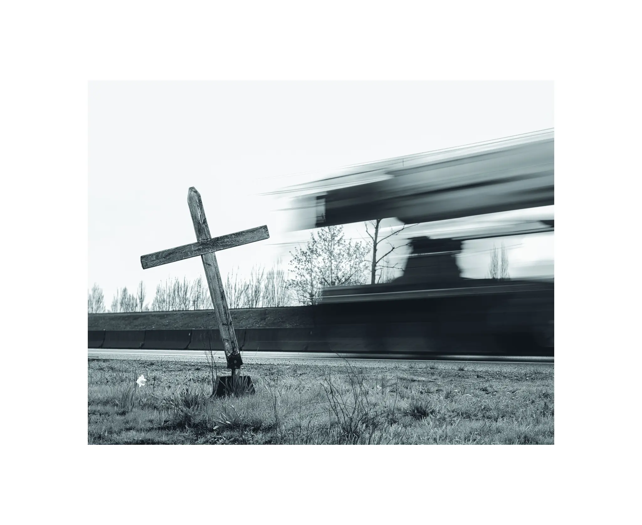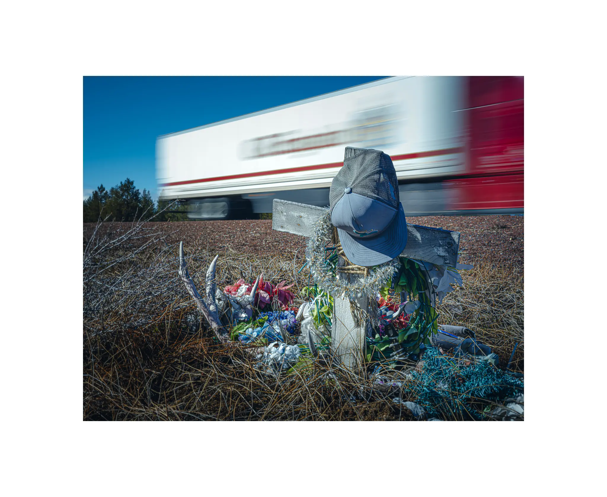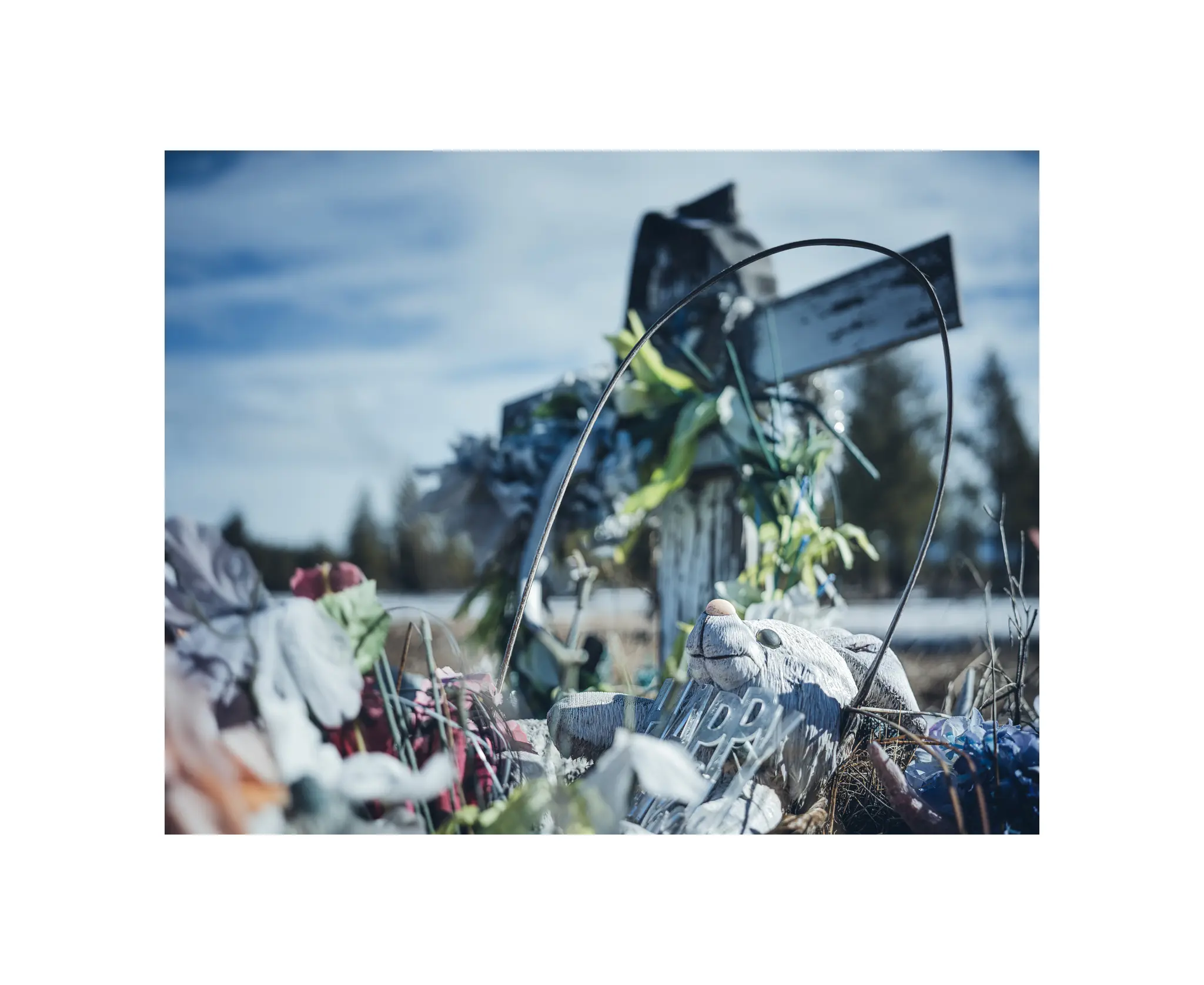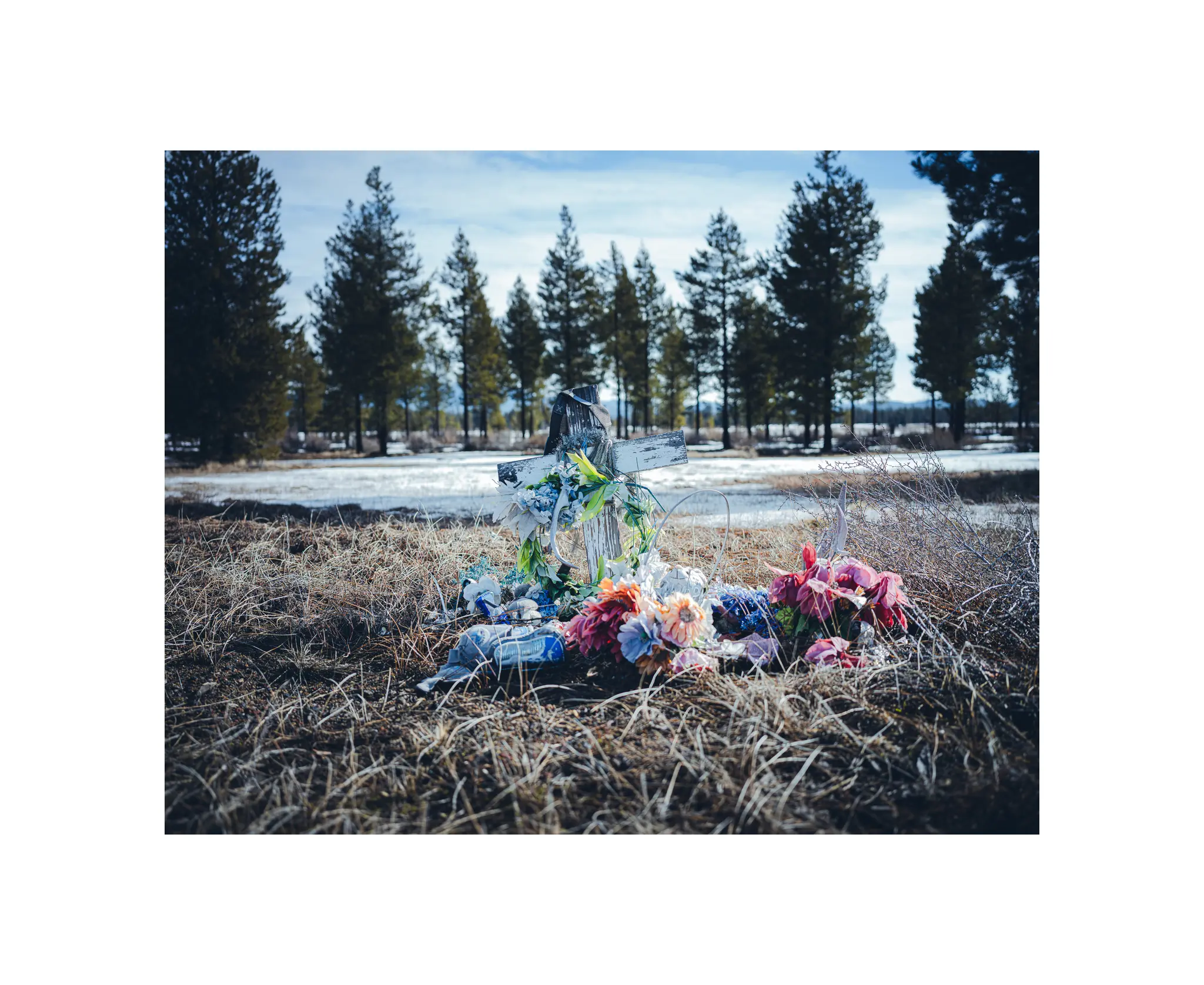 No names again but lots of flowers and decorations and what was, I imagine, someone’s beloved baseball cap hanging from the cross at this descanso where Jackpine Road ends at Oregon highway 97. It’s really quite a pretty little pile, despite showing its age.