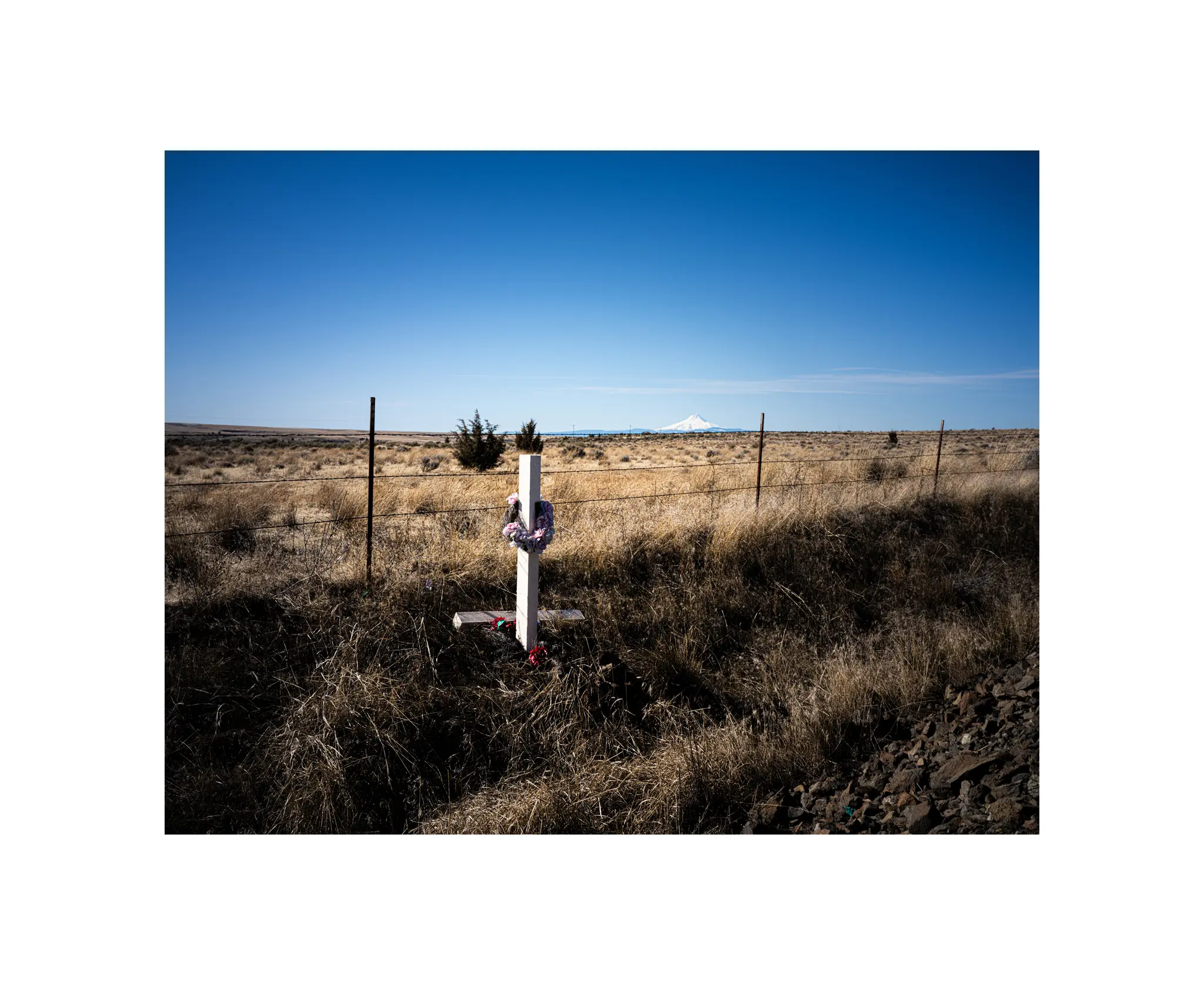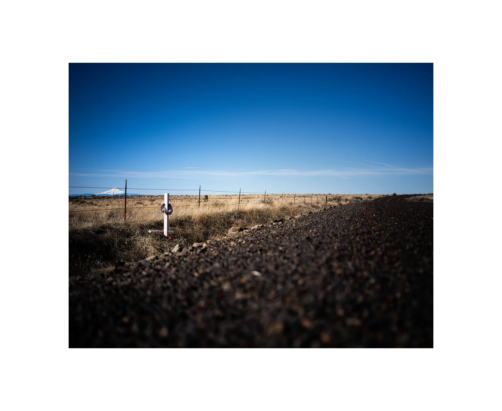 As we rolled along highway 97 I realized that this was going to take longer than I originally thought; there were a lot of descansos out here. This one had no information I could glean, but it had an incredible view of the mountains off in the distance.