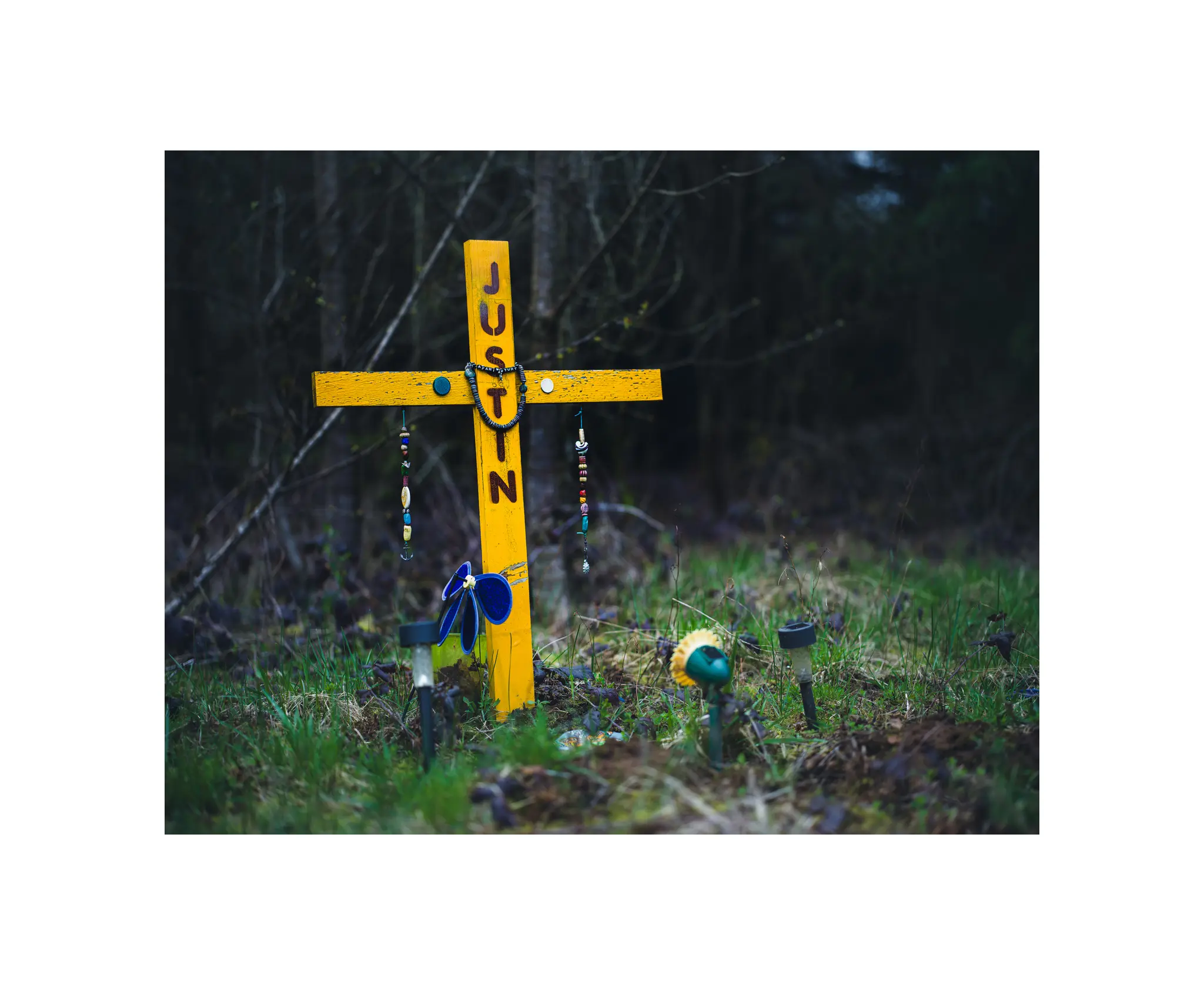 I was on my way to a few descansos that Reddit had tipped me off to and I found Justin. The yellow cross popped against the foliage and he was impossible to miss.