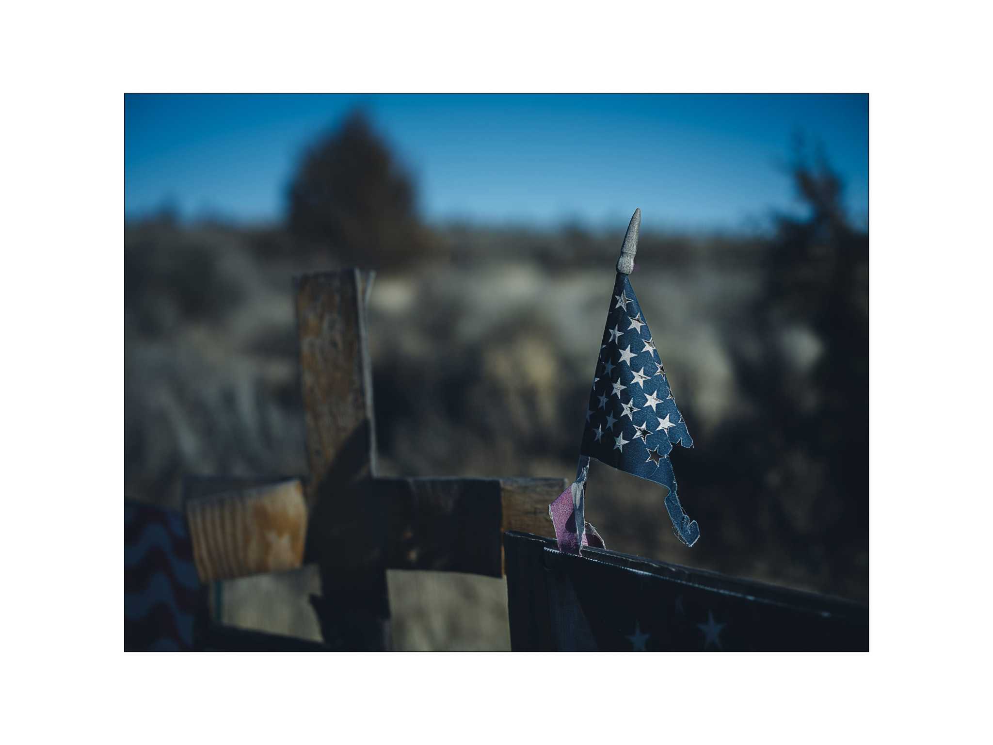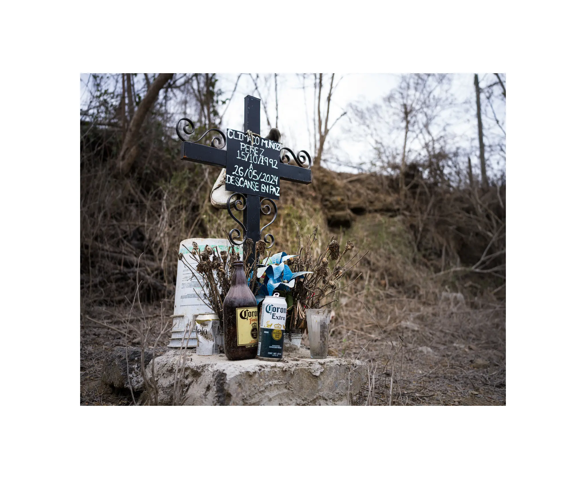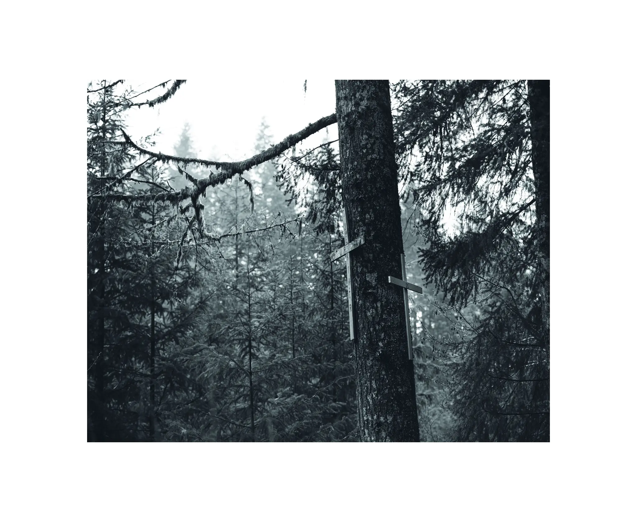 I feel like this is one of the better photos I have taken in my work with descansos. Two crosses, hung high in a tree, without any real decoration. The light from the rainy Oregon day hitting the adjacent trees nicely and setting a somber scene.