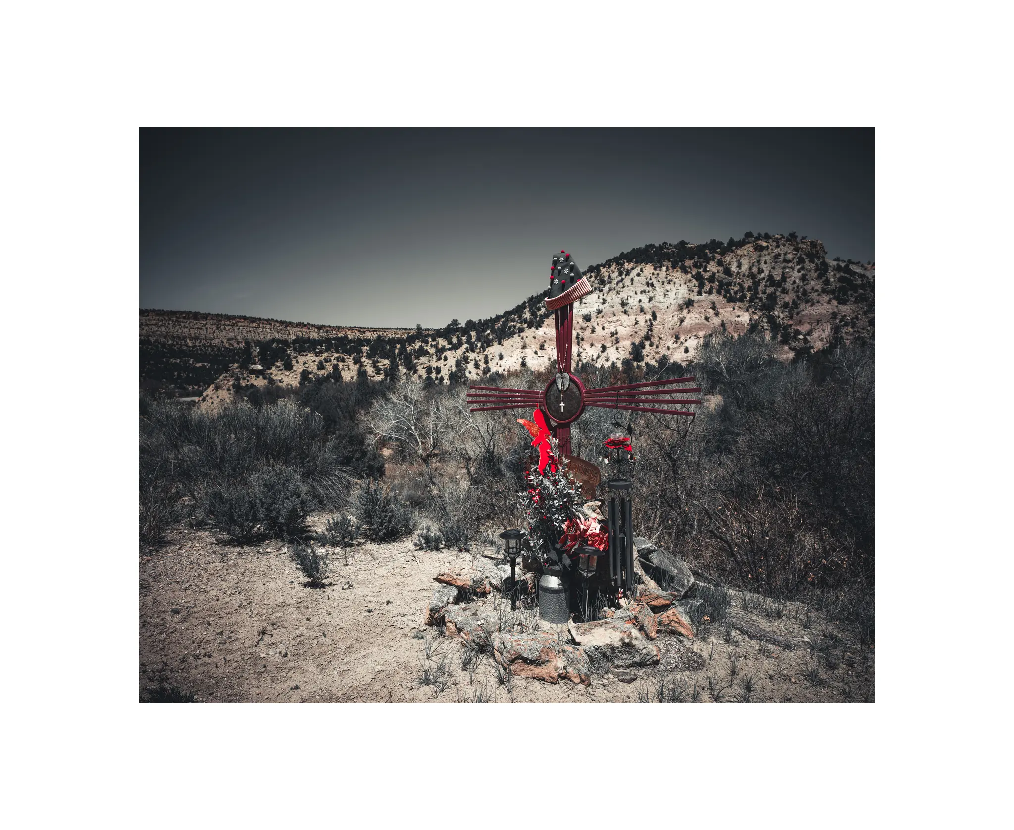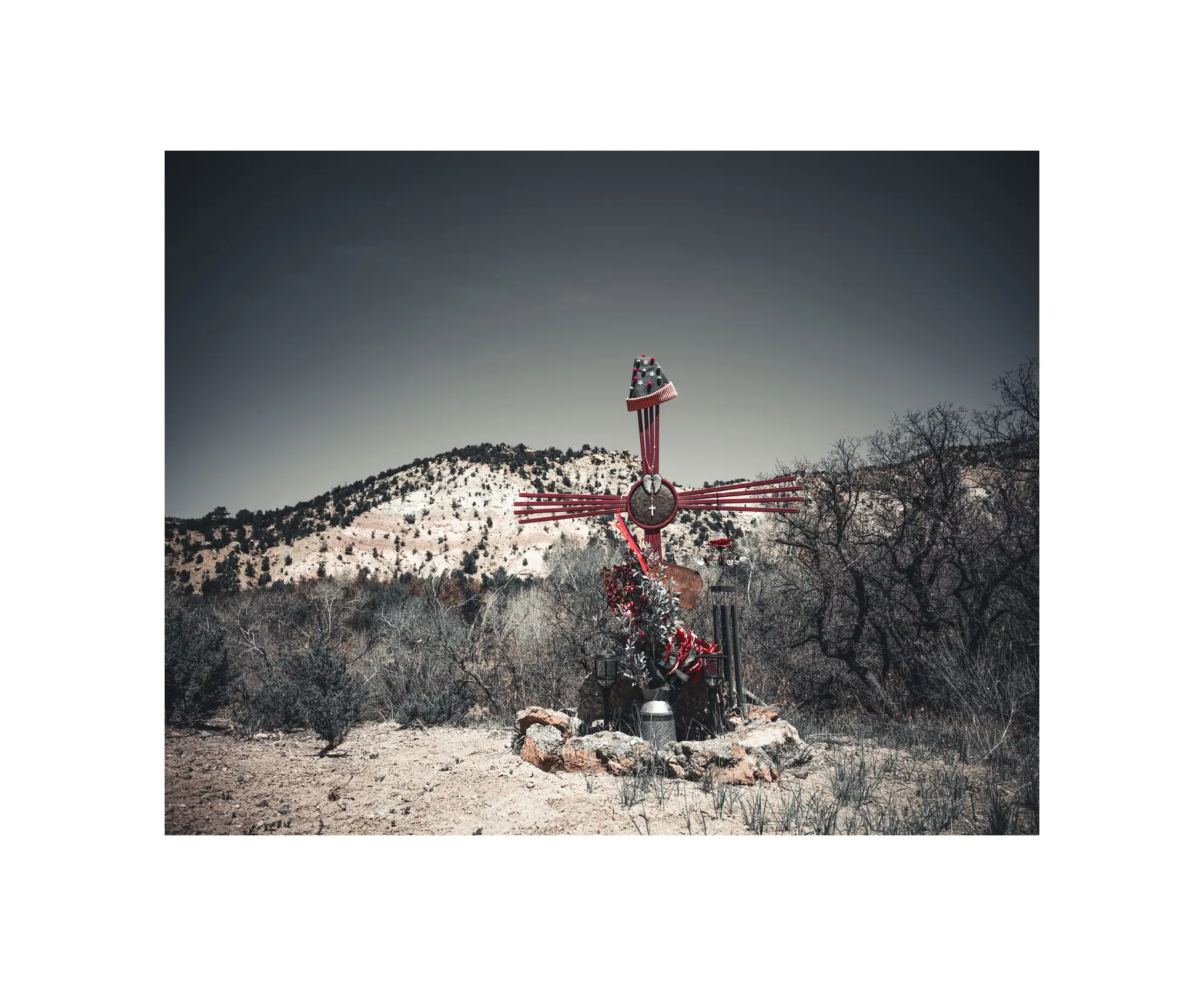 A brilliant pop of red against the brown and green backdrop of the low mountains of New Mexico, this memorial was an elaborate construction of metal and decorations that would not be out of place in an art museum.